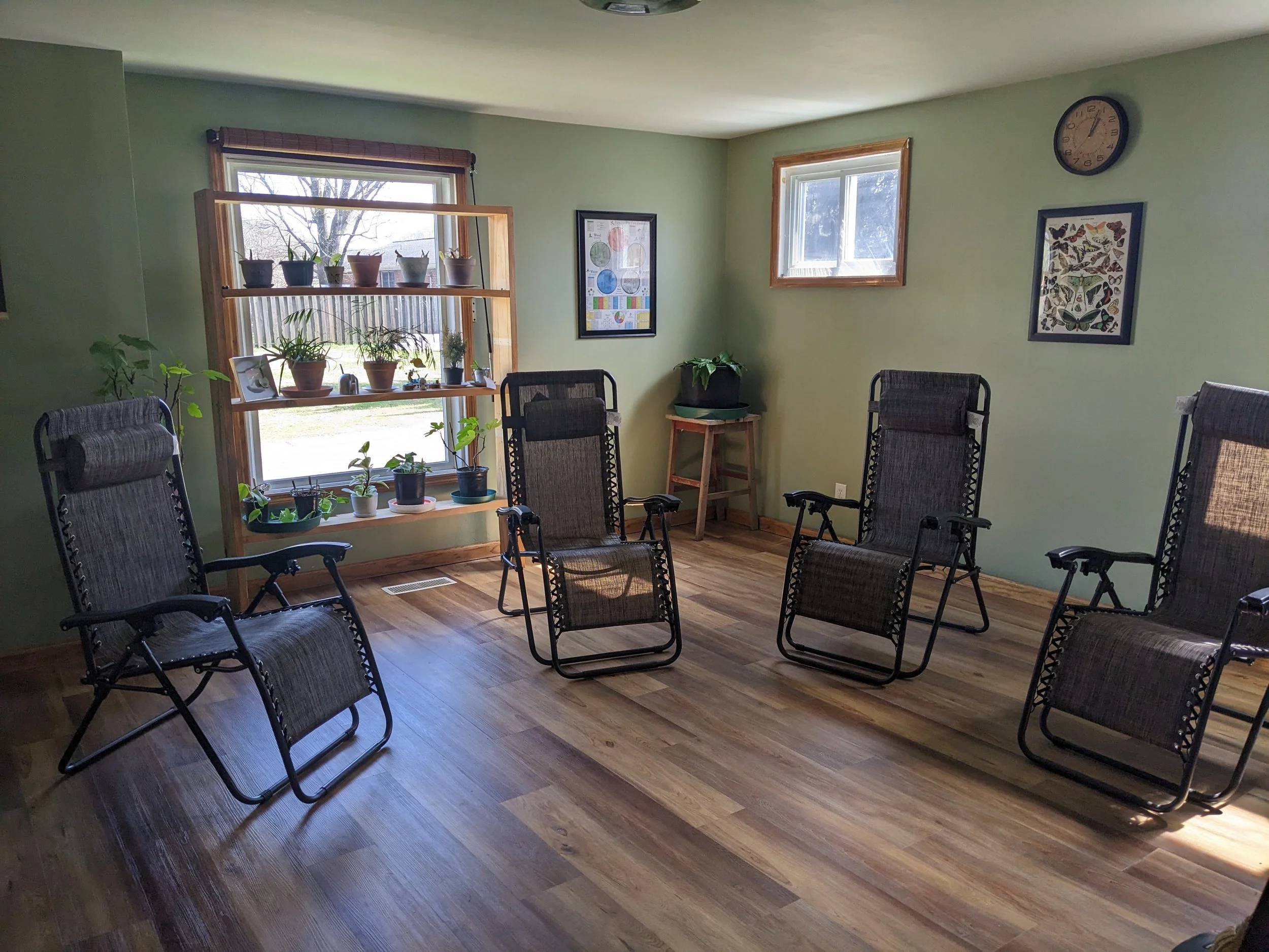 Community acupuncture is a way of increasing access to acupuncture for those who can’t afford regular private treatment. Our community room has five zero gravity lounge chairs and one treatment table. In this way, our acupuncturist can treat multiple people per hour using a “pay what you can afford” sliding scale fee structure. Our suggested sliding scale is $15-$60 per treatment. Those who can afford to pay $60 make it possible for us to treat more folks who can only afford $15. The community setting also provides an opportunity for patients to share in the healing energy that gets amplified during community care.